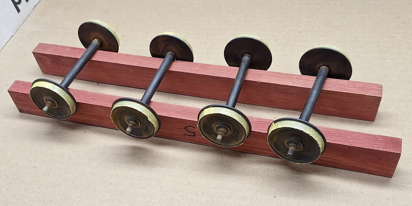 The steel wheelsets needed a different approach. After rinsing / cleaning in IPA, I let them soak in Jax Steel / Iron / Nickel Blackener, then rinsed in water. I did that a couple more times, wiping off rust (mostly) until they were gray-black. Then masked the treads and sprayed with flat clearcoat.