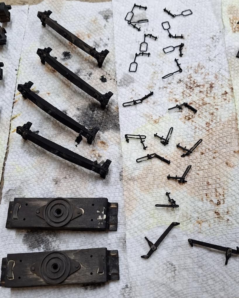 I’ll touch up the bolsters & etc. later, but I wanted to get all the main blackening done before assembling the trucks. I’d pre-assembled those and the brake beams, and first “blackened” the wood with 100% india ink. Then rinsed them in IPA, swiched them in Jax Pewter Black for a half minute, rinsed in water and set to dry.