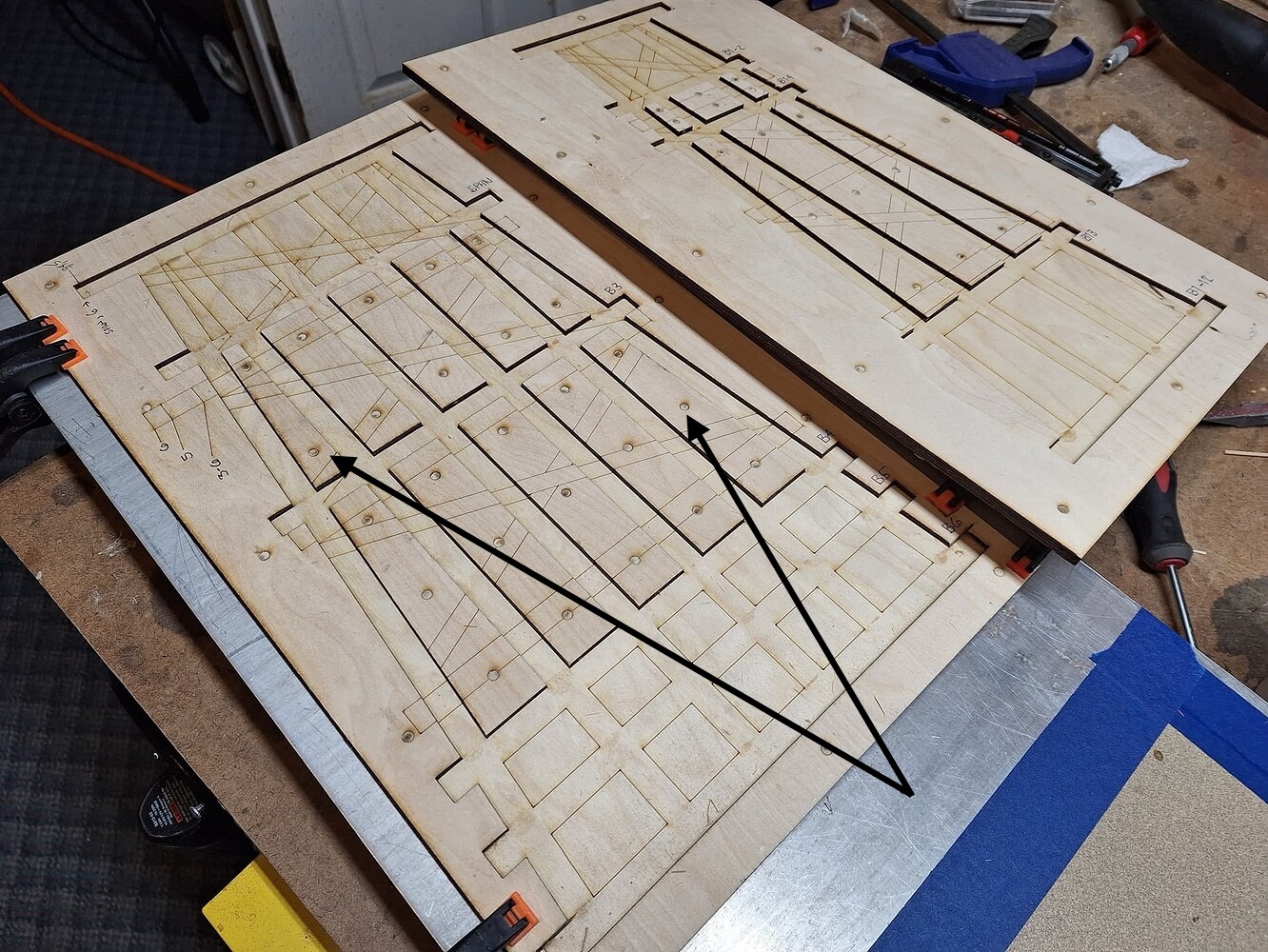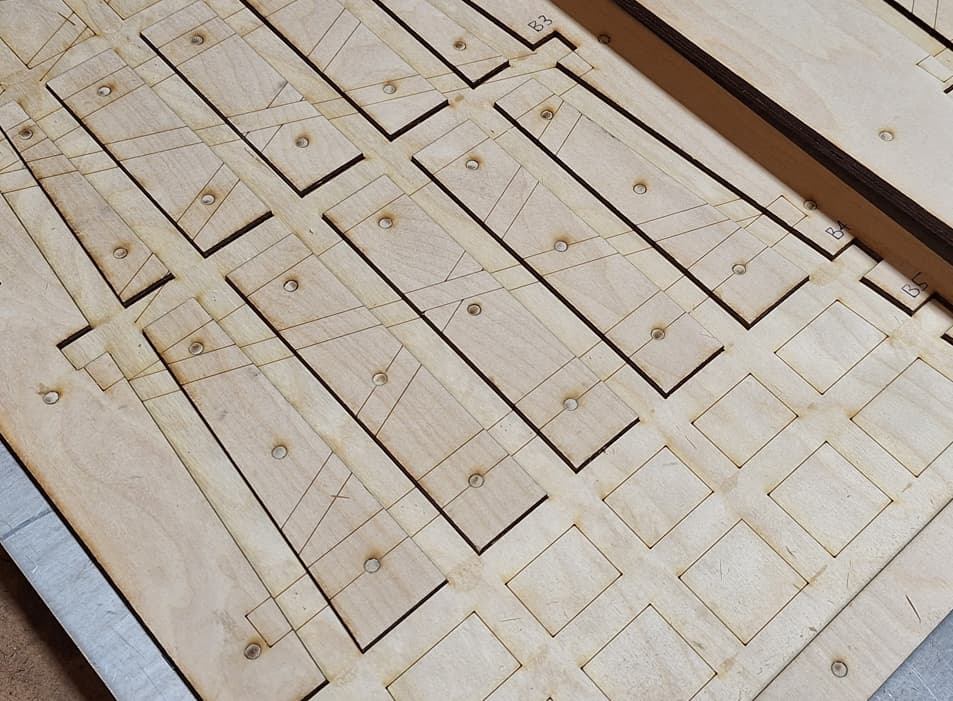 The pegs are bits of bamboo food skewers, tapped into slightly undersized holes which are lasered along with everything else. That ensures proper registration, and a firm grip without glue in case I needed to alter anything. But I glued it anyway, couldn’t help it.