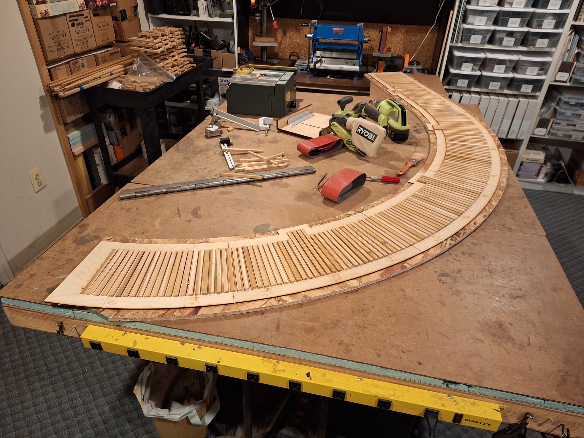 Today I got the ties planed and cut, set in the jig and sanded a bit.