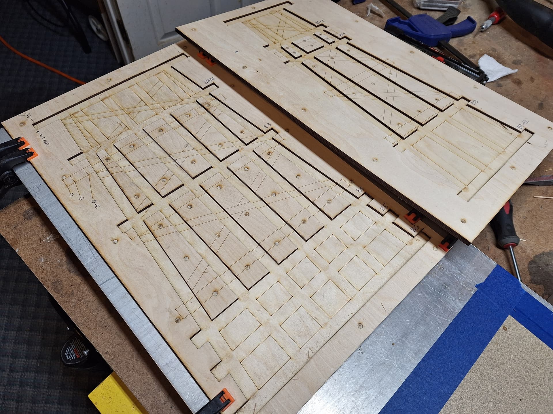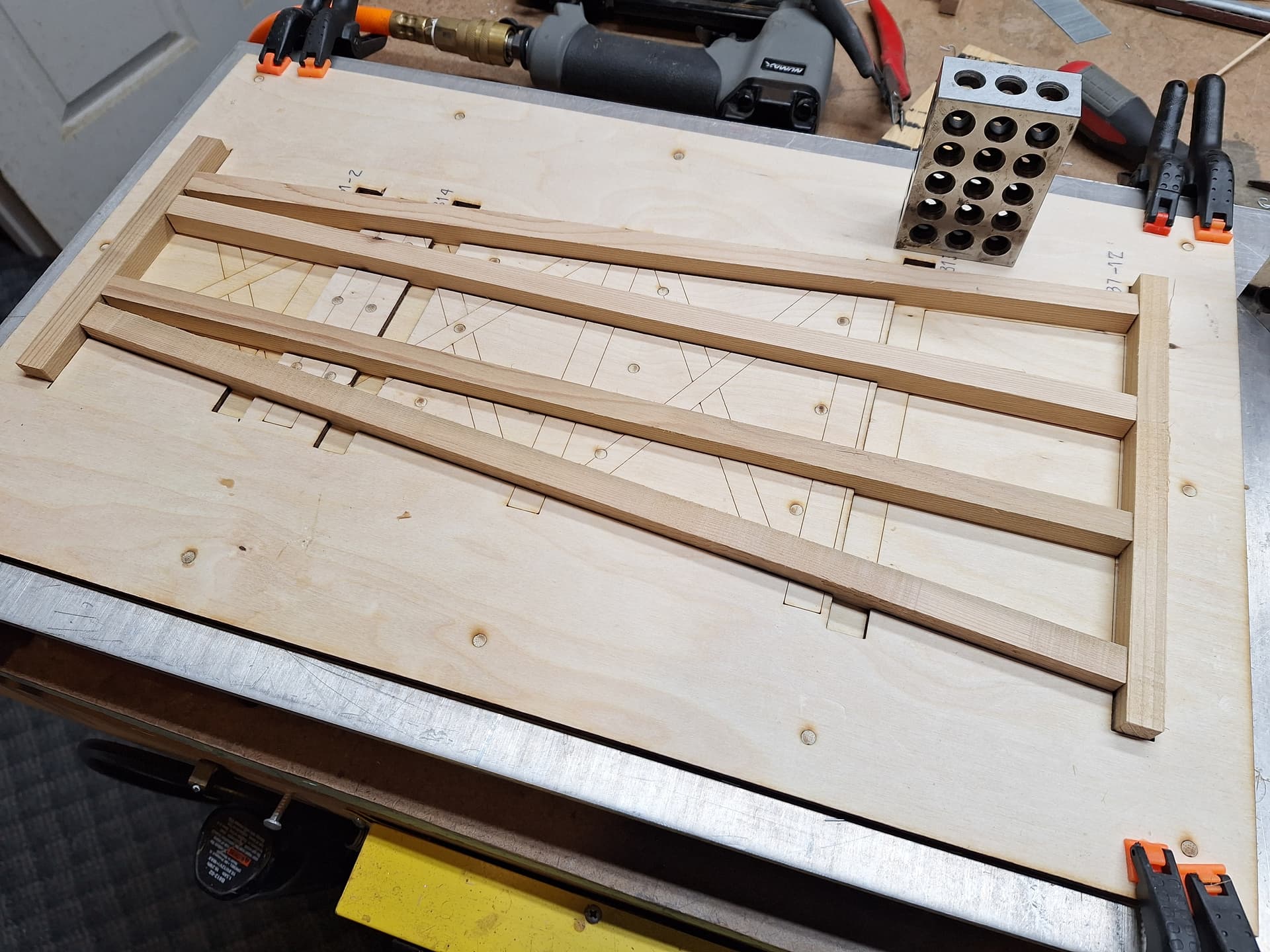 Last Sunday I pre-cut the bent pieces, and during the week made the new bent templates, since there was too much redesign to salvage the ones I’d made a few years back. No big deal though. I had some 1/8" plywood leftover from a project, and only needed the two templates.