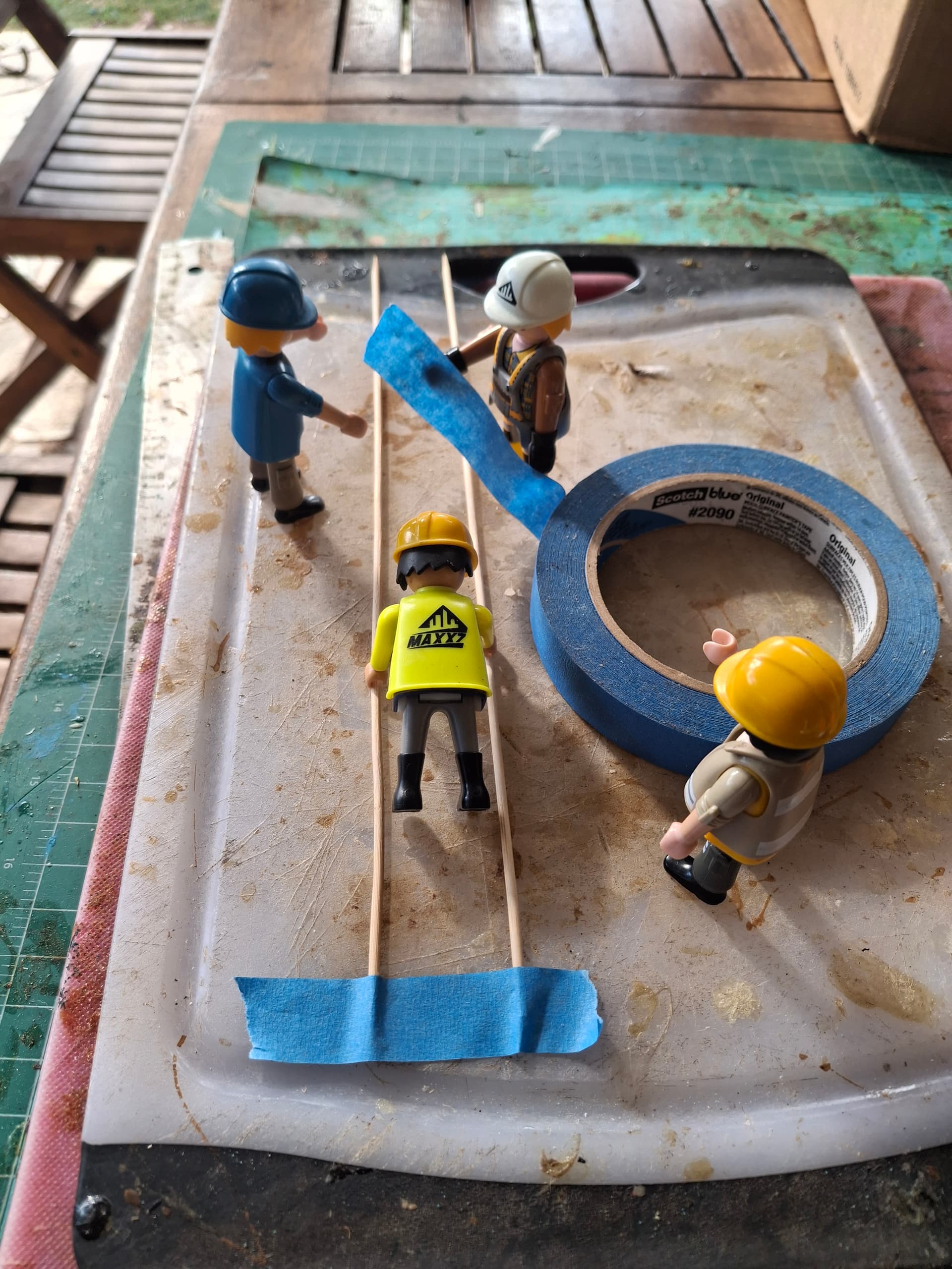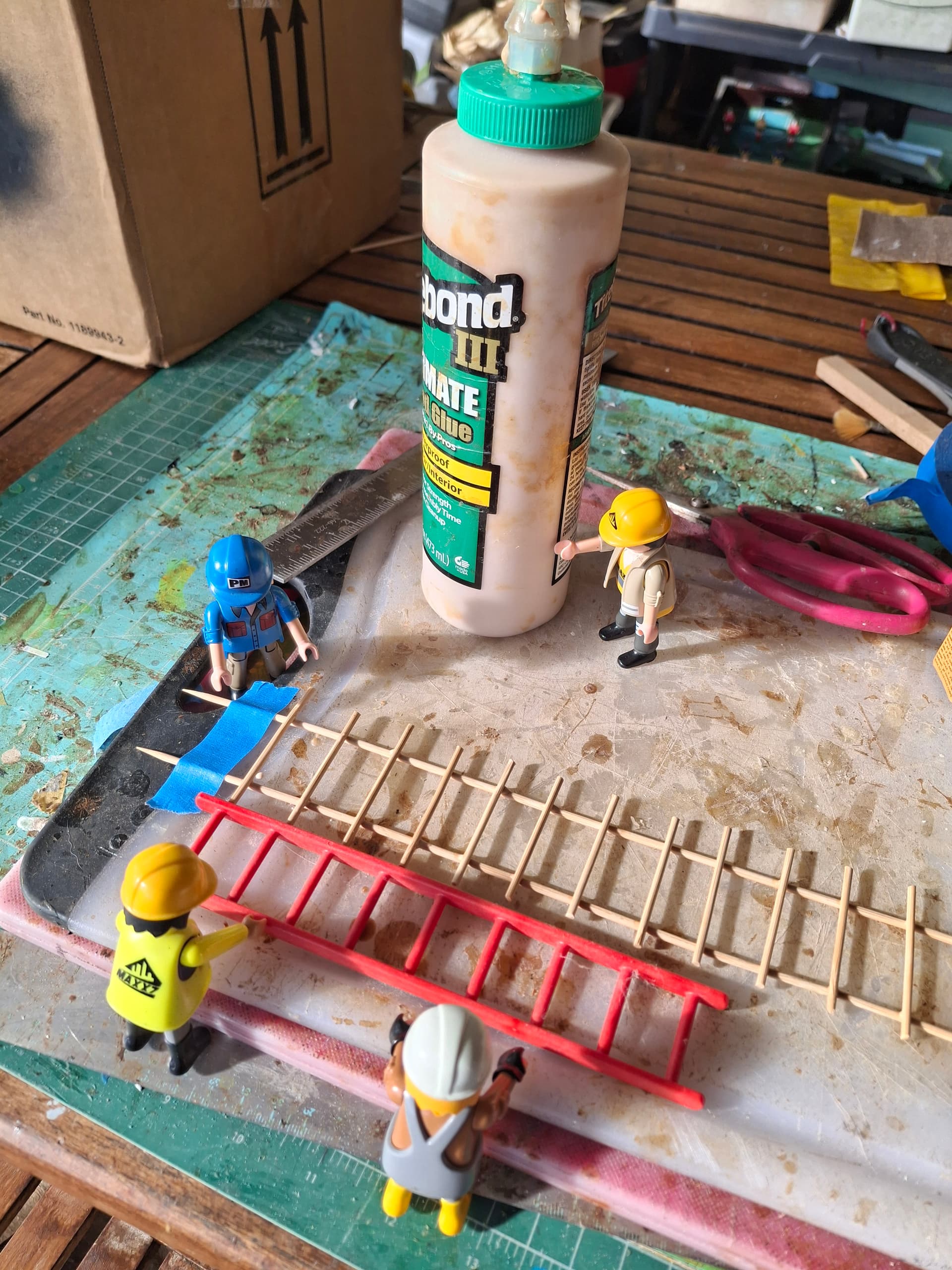 This project has lumbered forward, all the same, with the Thanksgiving weekend offering a chance to work in fits and starts. One spasm of activity resulted in a pair of ladders. The 1:24 crew and a PLAYMOBIL ladder helped with the spacing: