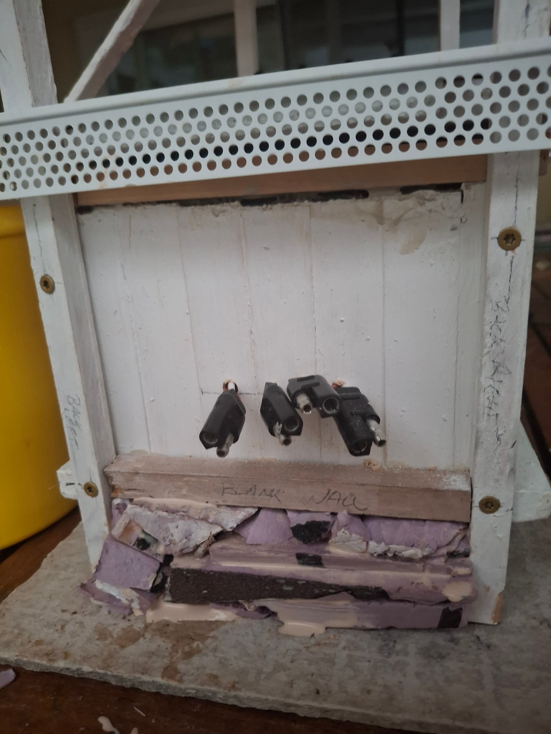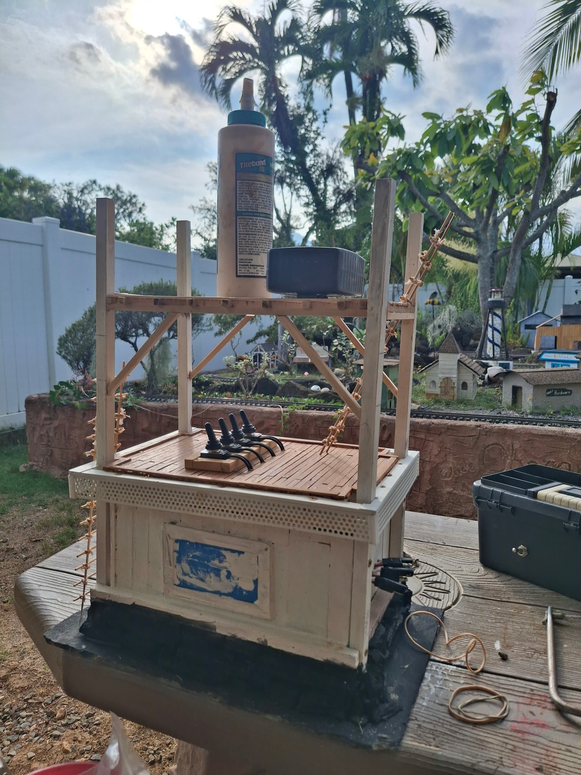 In actual work, I did seal all gaps with various outdoor grade caulking glue. Those areas that trapped water had the worst rot. Now, those pockets are filled with outdoor grade caulking glue! This means I am set to prime the core building as well as the tower supports. As this next weekend will have larger time packets, I hope to get that done, and Kid-zilla and I hope to rig the wiring.