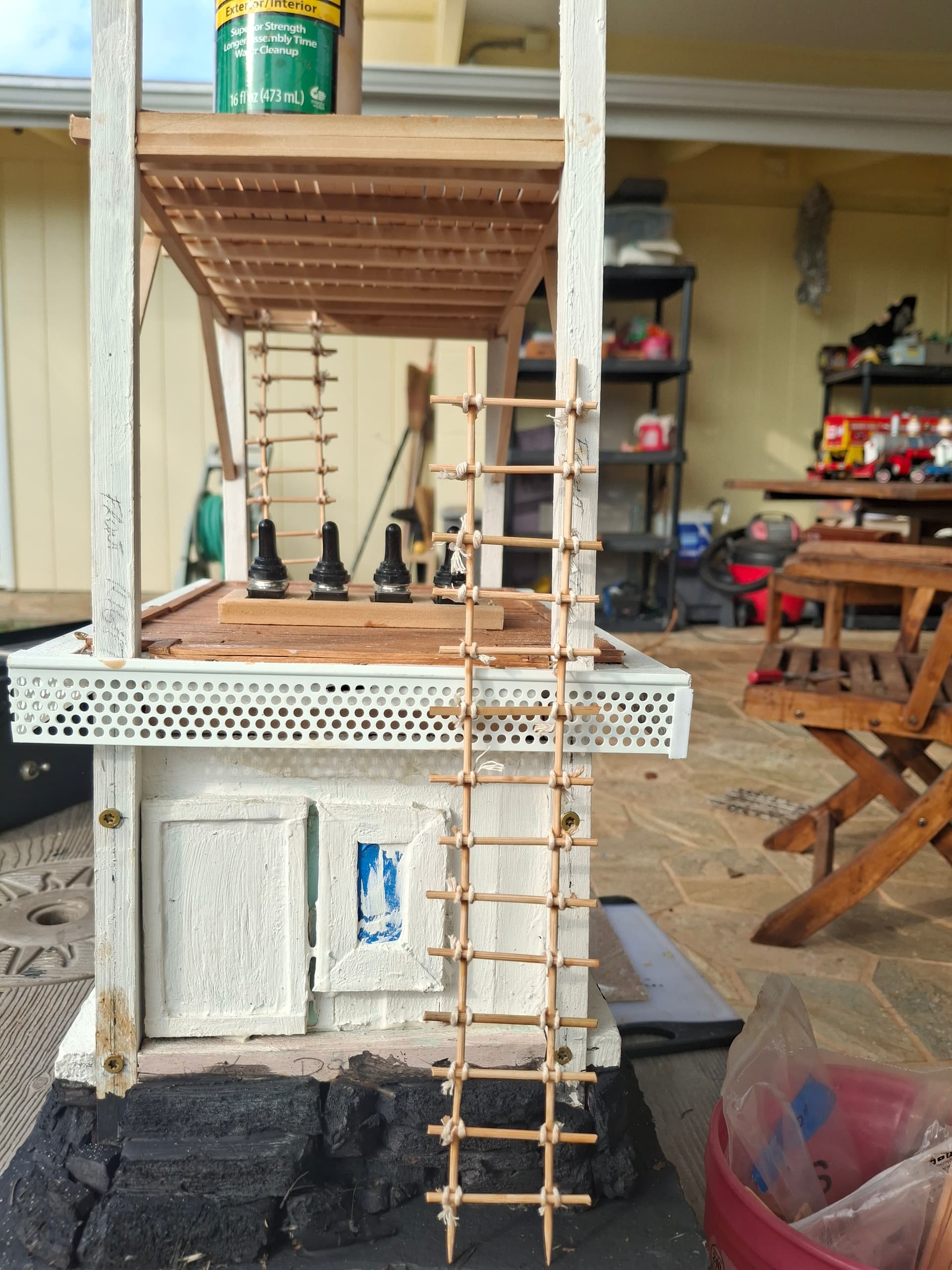 Slow progress. I’ll blame odd work schedules…and the call of the ocean…and the end of the summer dive season…and some rocketry…In all honesty, I had lots of packets of time, but not to do the steps that need to happen next. The exception being working with Kid-zilla and the 1:24 gang to cut the timbers for the observation tower.