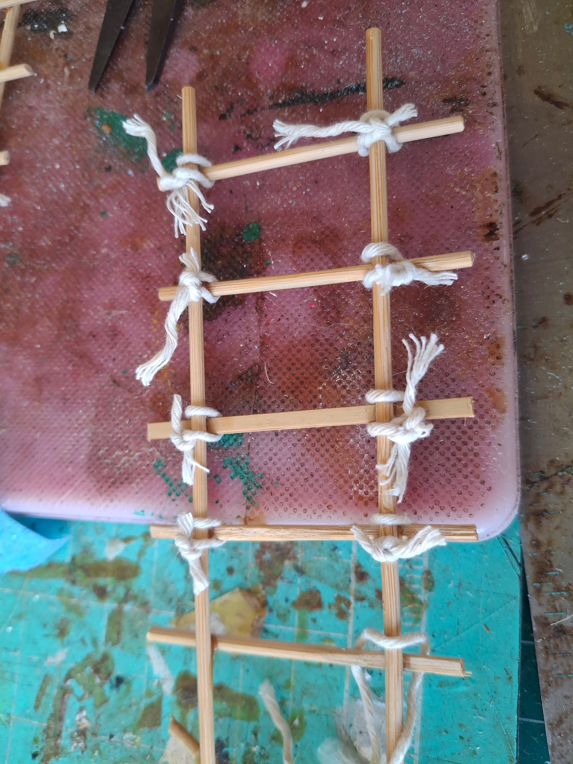 The material is a kebab skewer, glued in place with TiteBond III, then lashed with a bit of twine. I lathered the lashing in more TiteBond III to reinforce the lot. The picture below shows the lashings without the glue.