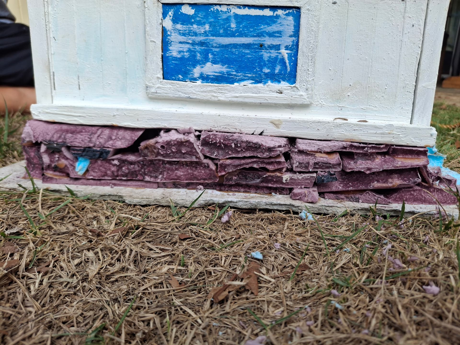 Tonight, I began glueing foam scraps around the base to replace the long-rotted “stone foundation.”