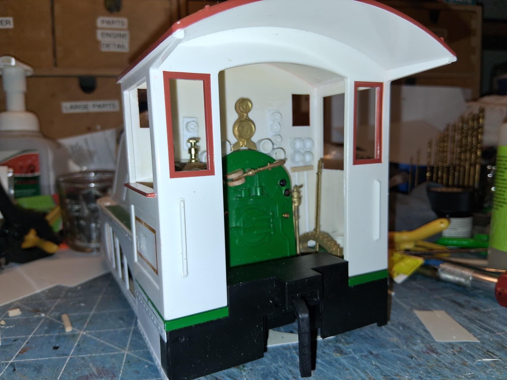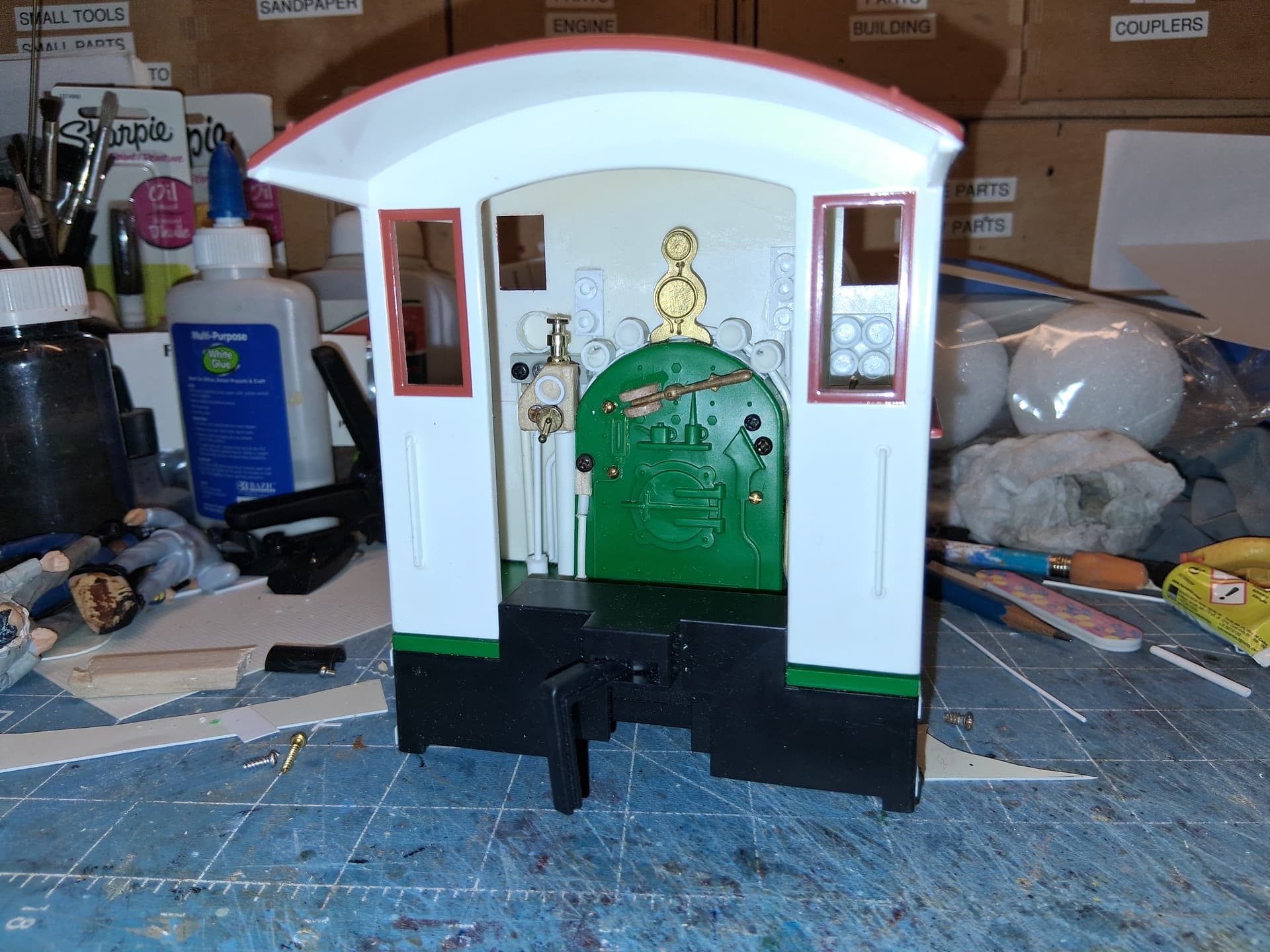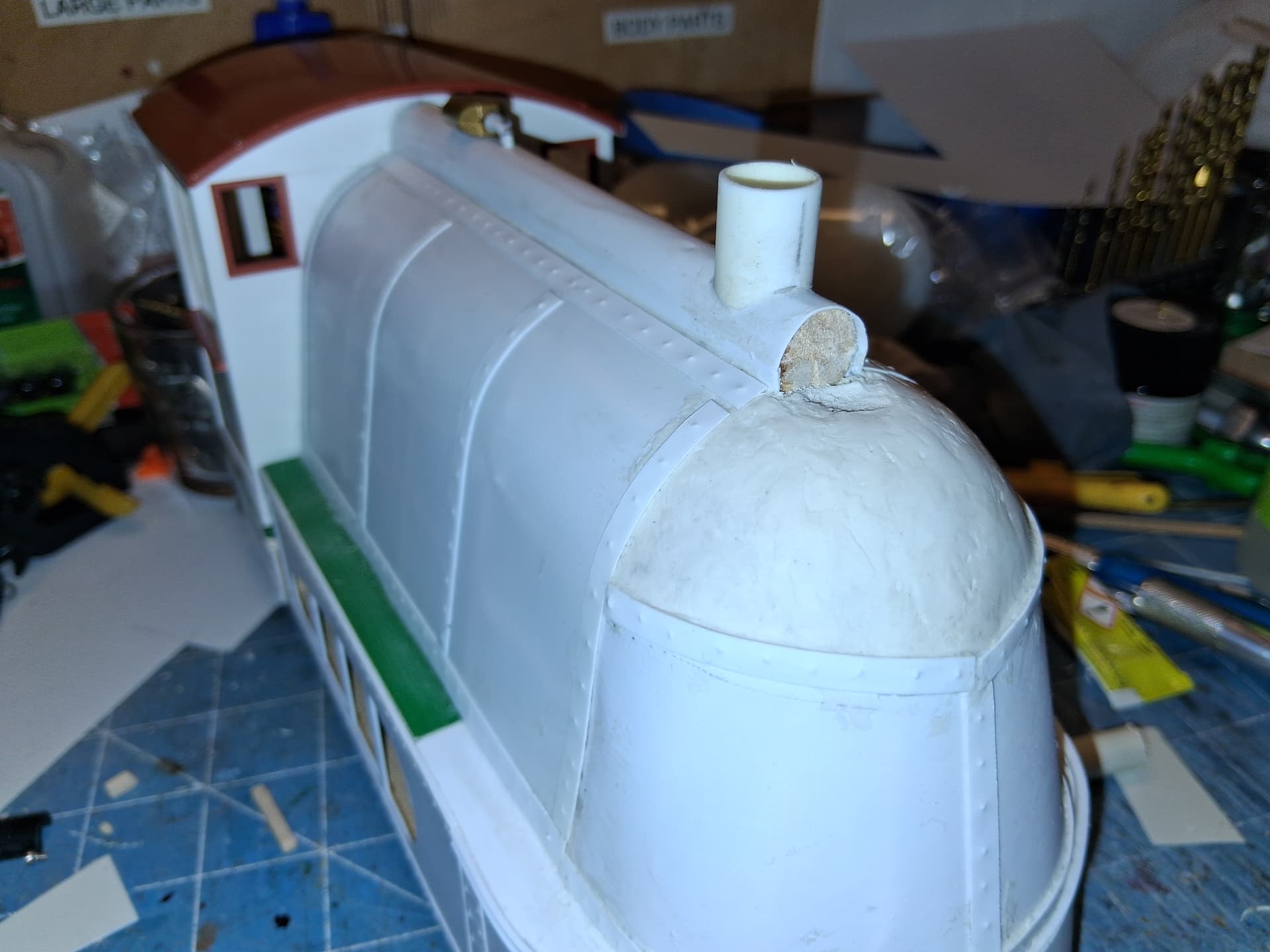 For the pilot plates and the boiler front, I created a styrene and wood framework lined with a balsa or basswood edging. For the plates I took a thin paper sheet fixed with tape at one point usually a straight line point. Then I carefully worked the paper to the edges of the plate area using a pencil point then marked the plate edge with the pencil onto the paper creating a pattern, this pattern was then transferred to a sheet of styrene. I used 0.10 thick styrene because it is very easy to apply to a curved surface. I then test fit it, made slight trimmings, and then glued one side let it set, then slowly worked my way across the framework, gluing it down. Once glued and set I added the strips of 0.10 with rivets embossed. any gaps were eventually filled in with Alex painters caulk. For the roundy bit in front of the smokestake, thats a styrofoam ball with multiple Alex caulk coating till I had a smooth surface.