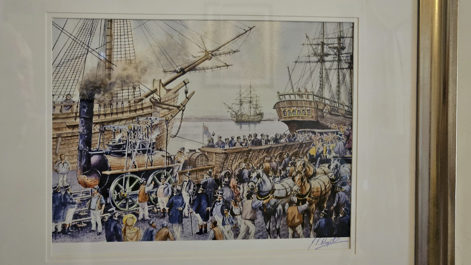 While we were vacationing in the UK, we saw the Annual Exhibition of the Guild of Railway Artists, in the museum at Kidderminster on the Severn Valley Railway. This pic was a watercolor commissioned by Friends of the Stockton & Darlington, and shows the βfirst trainβ arriving at Stockton Wharf.